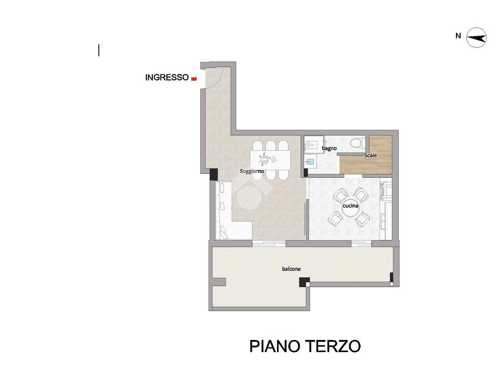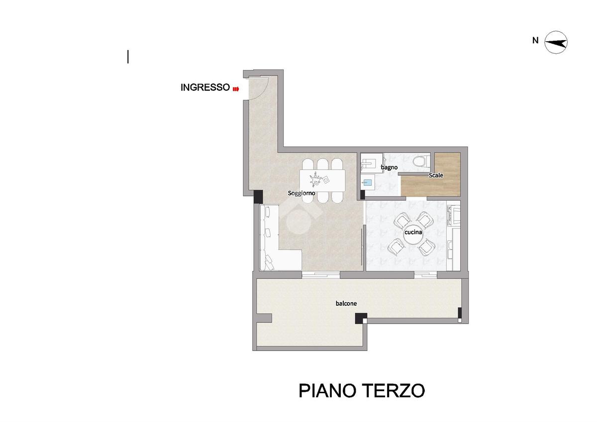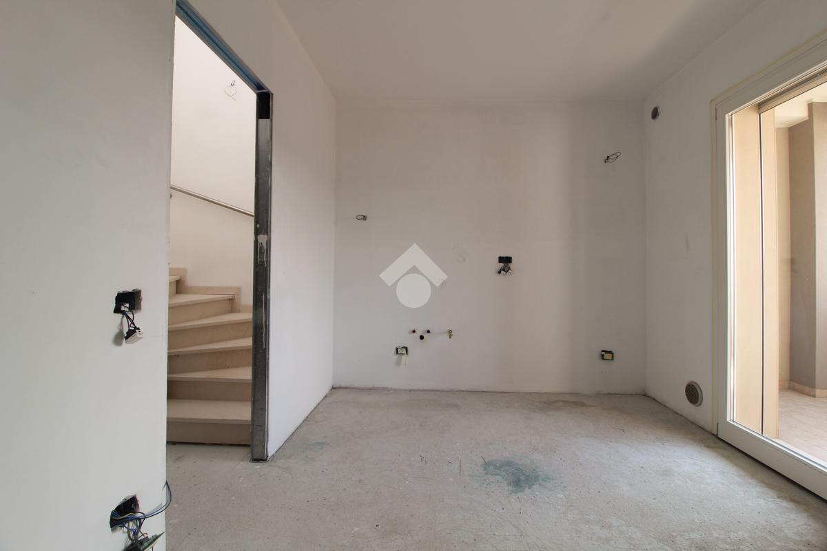 L'ingresso dell'appartamento si apre sul soggiorno con zona pranzo separata, accompagnato da un comodo terrazzo. Allo stesso piano, troverete un bagno moderno con box doccia e scale illuminate che conducono alla zona notte situata al piano superiore.