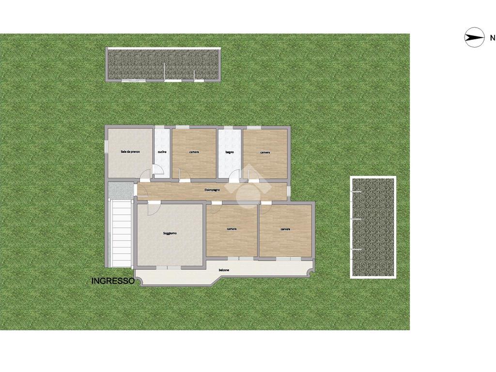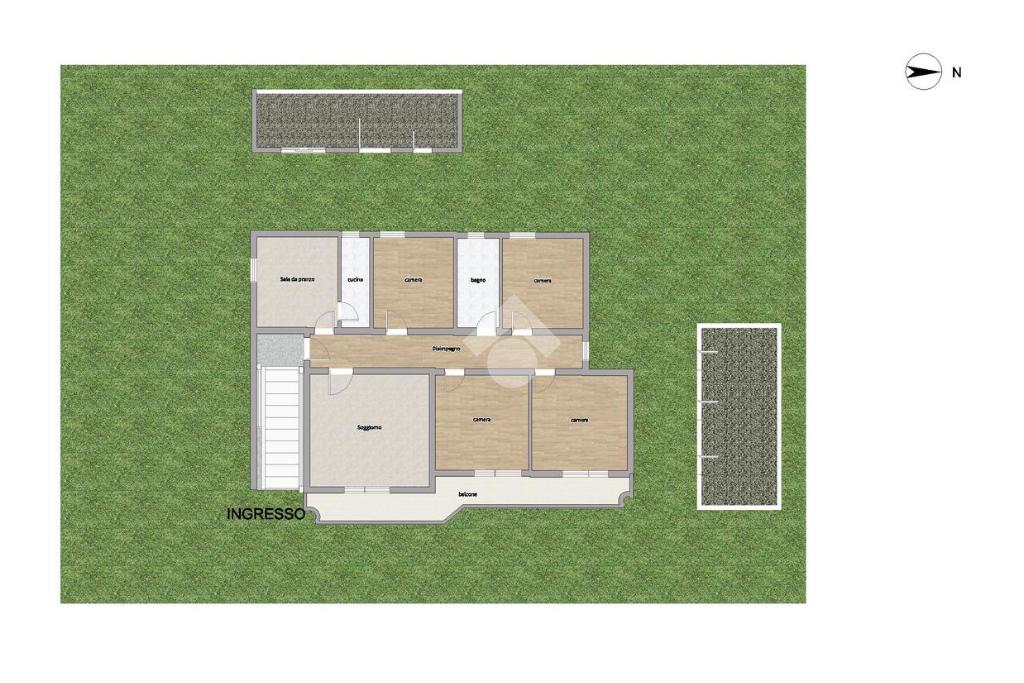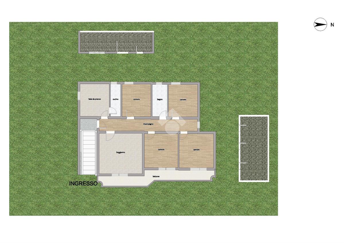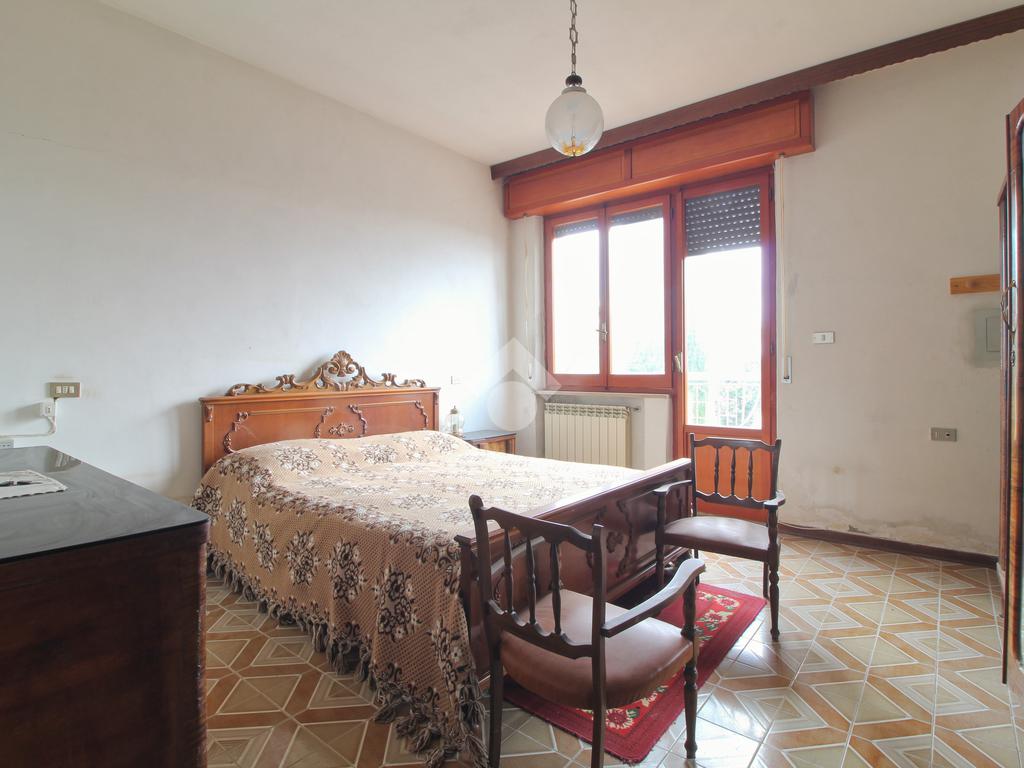 L'accesso principale all'immobile è sia carrabile che pedonale, permettendo di entrare comodamente dal lato strada, dove si apre una corte pavimentata, circondata da un giardino che dona un'atmosfera serena e accogliente. Le scale esterne conducono all'abitazione principale, organizzata in modo funzionale con un ampio soggiorno, una cucina separata completa di retrocucina, quattro spaziose camere da letto e un bagno dotato di vasca. Un balcone collega il soggiorno a due delle camere, offrendo uno spazio ideale per momenti di relax con vista.